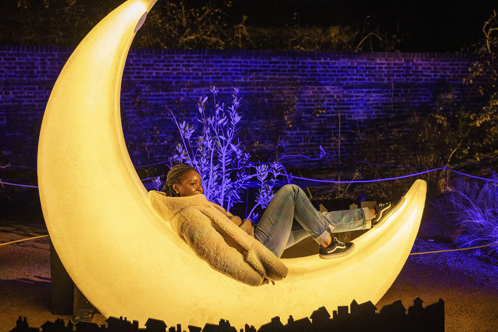 A Lullaby for…: A large illuminated crescent moon, you are invited to sit down and hear a unique piece of music, written with parents in creative writing workshops.